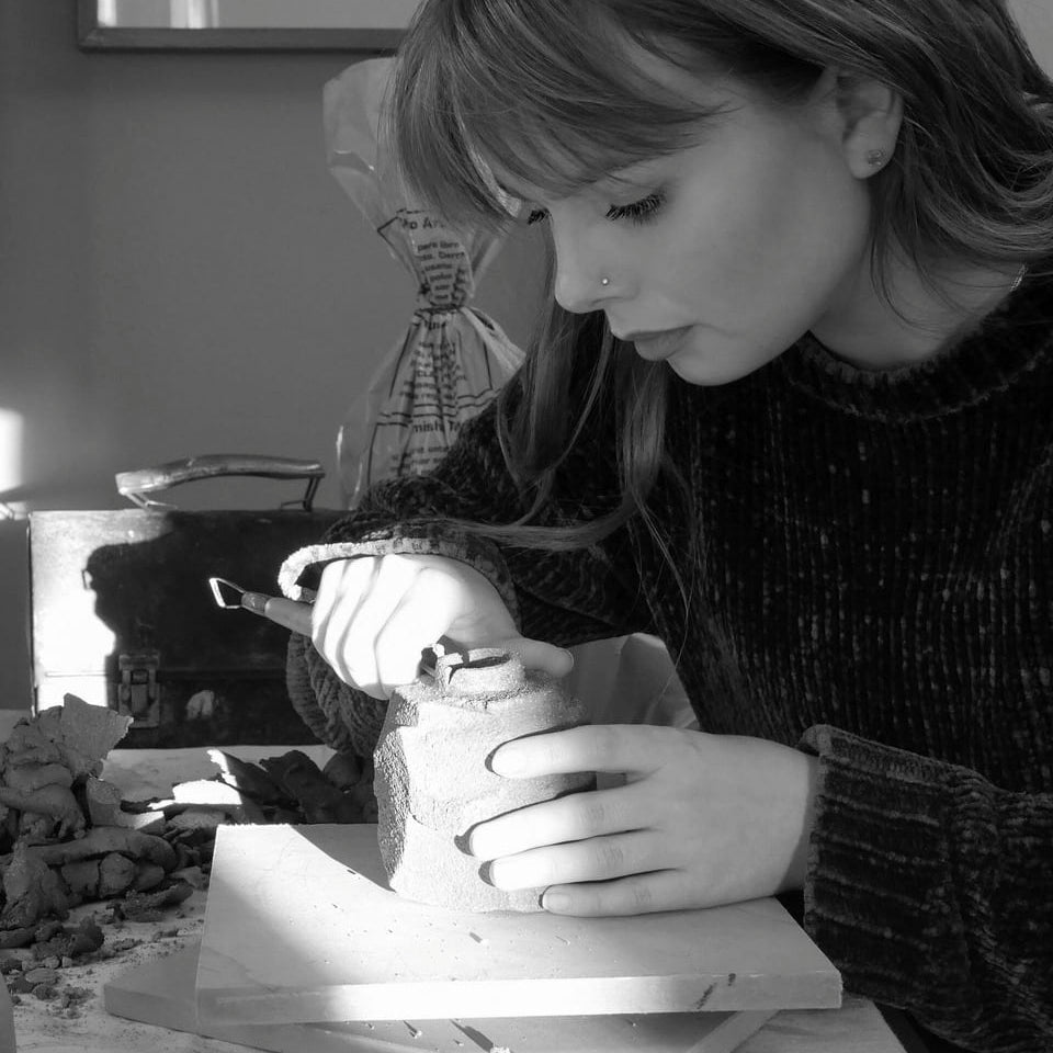 Impressions of the makers hand and tools are visible in this high fired clay.