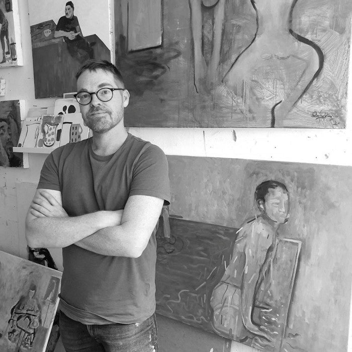 The canvas boards used in this still life series were originally used as palettes to mix the paints and colours for the artists larger paintings. The beautiful expressive and abstract backgrounds created through process became the starting canvas for these new artworks using images and shapes that were unconsciously created. The result is a naive, tactile and energetic depiction of everyday scenes.